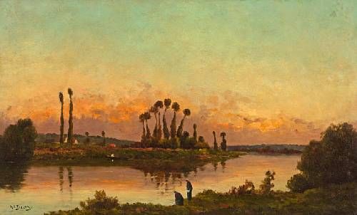 Washerwomen beside a river at sunset