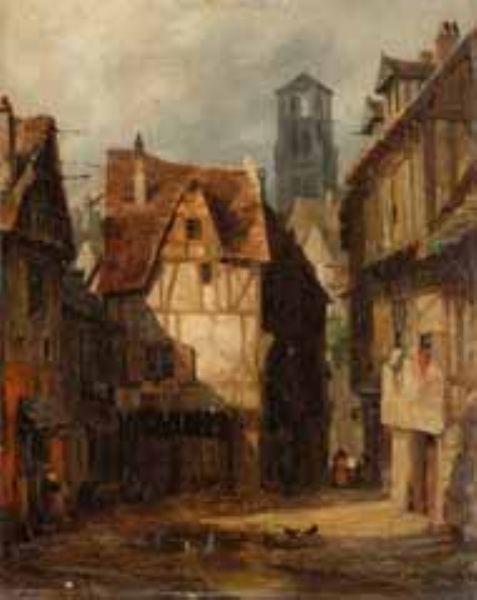 Ansicht einer französischen Stadt mit Fachwerkhäusern sern