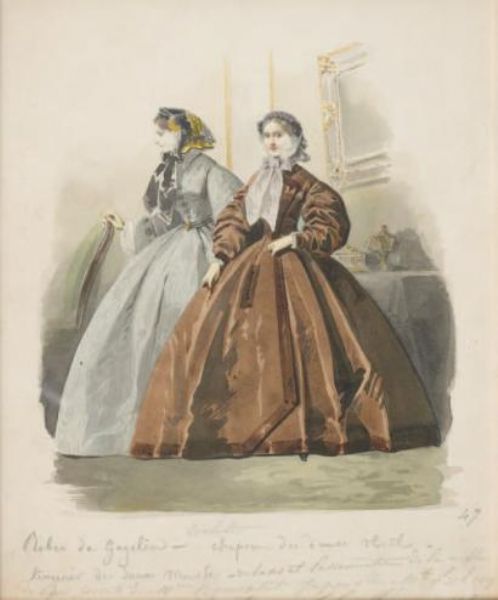 Deux élégantes dans un interieur, l'une en robe grise, l'autre marron.