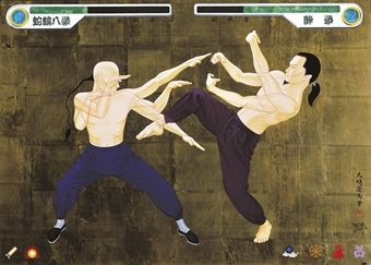| Eight 'Serpent and Crane' Moves vs. 'Drunken Fists' Ukiyo-e Manga Game of Hybrid Combat on Gold Leaf | |