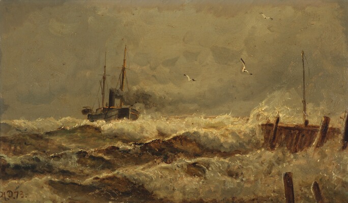 Seascape with steam boat in rough seas