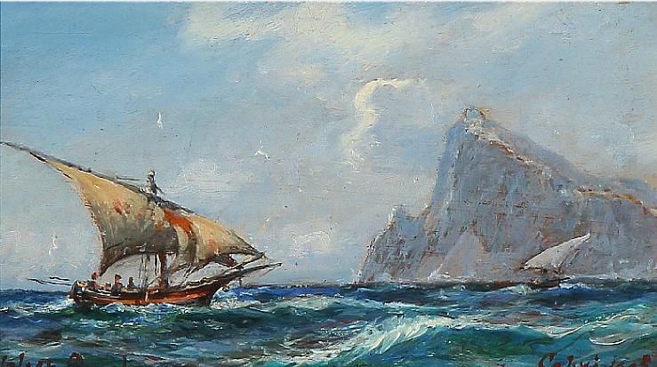 | Sailing ships out shore a rocky coastline, Capri. | |