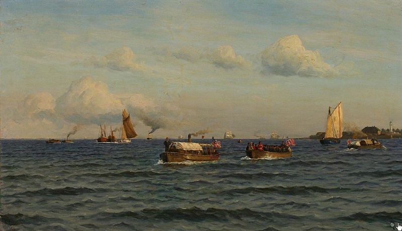 | Barges and rowing boat with the American flag at Trekroner off Copenhagen. | |