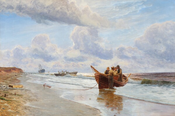 Coastal scene with fishermen returning with the day's catch