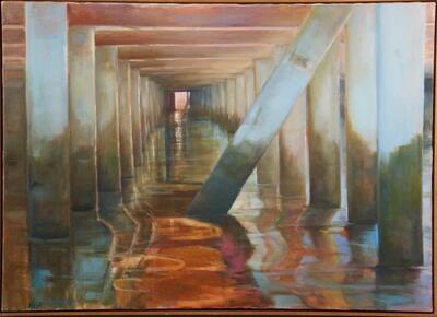 From the "Pier Painting" series, no tag, oil on canvas, initialed lower left, in mahogany slat shadow line frame, OS: 31" x 43", SS: 30" x 42". Fine condition. Proceeds to benefit the Animal Refuge League of Greater Portland. | |