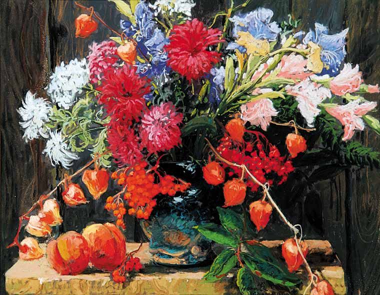 Peaches, Orange Lanterns, Dalias and Gladiolas