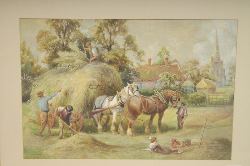 | Figures Haymaking with Shire Horses Pulling a Haycart and a Dog in the Foreground | |