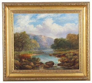 A wooded river landscape, the Highlands beyond