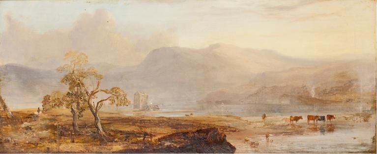 CATTLE WATERING IN A HIGHLAND LANDSCAPE
