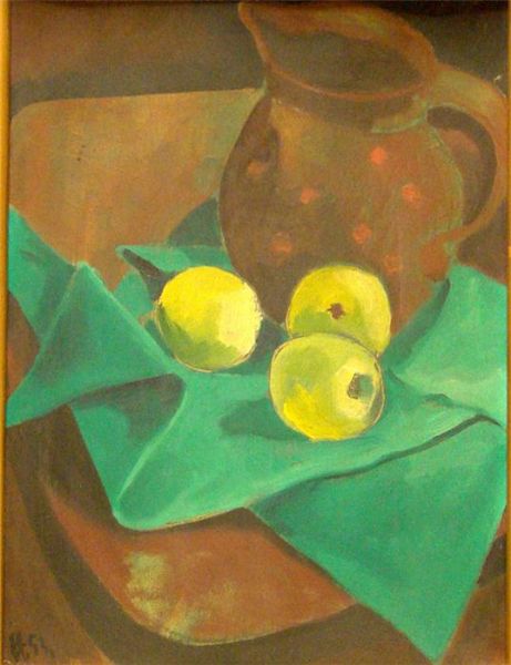 Stillleben mit Krug und Zitronen auf grünem Tuch arrangiert