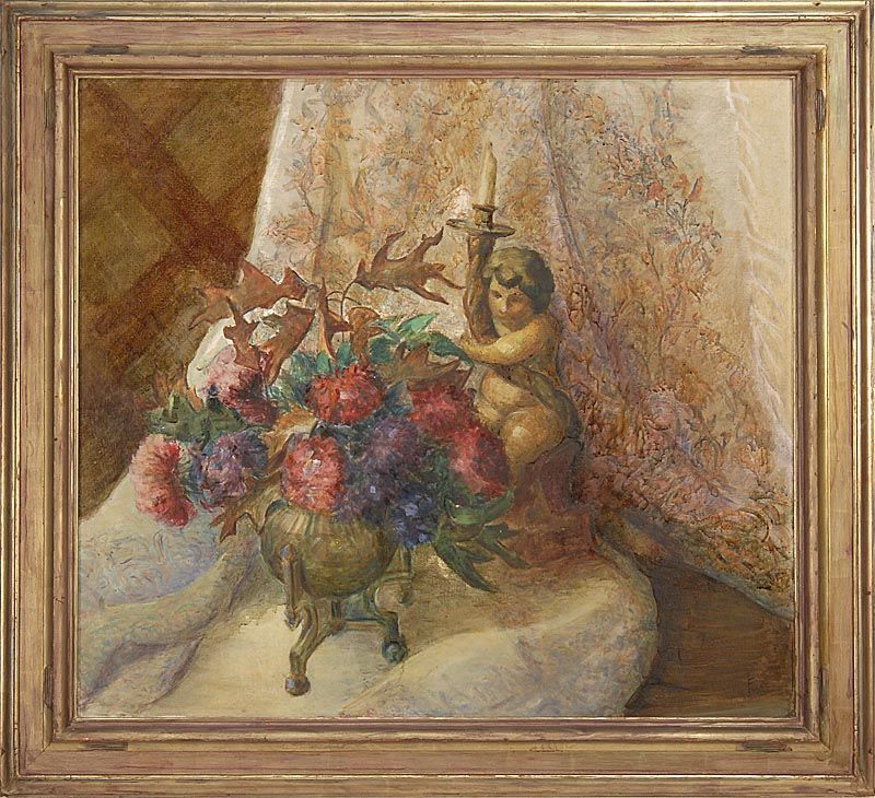 Still life of a floral arrangement and a cherub-form candlestick.