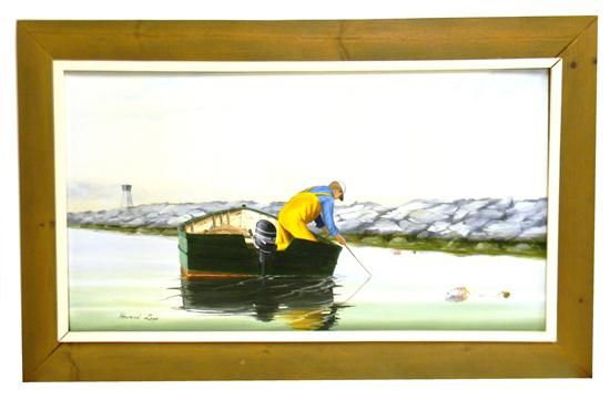 | depicting lobster fisherman in bright yellow overalls leaning over green motor boat to adjust trap line, rocky pier with signal | |