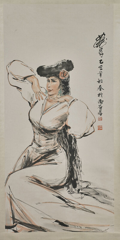Chinese ink and color paper scroll after Huang Zhou; showing a female dancer; signed, with seal marks; 51" x 25" (approx.) | |