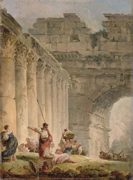 | A capriccio of a classical colonnade and a triumphal arch with a soldier and washerwomen on a bank | |