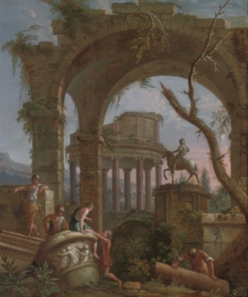 | A capriccio of classical ruins with soldiers resting by a giant urn | |