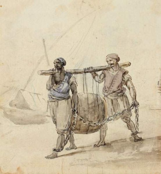 Deux galériens enchaînés portant un tonneau