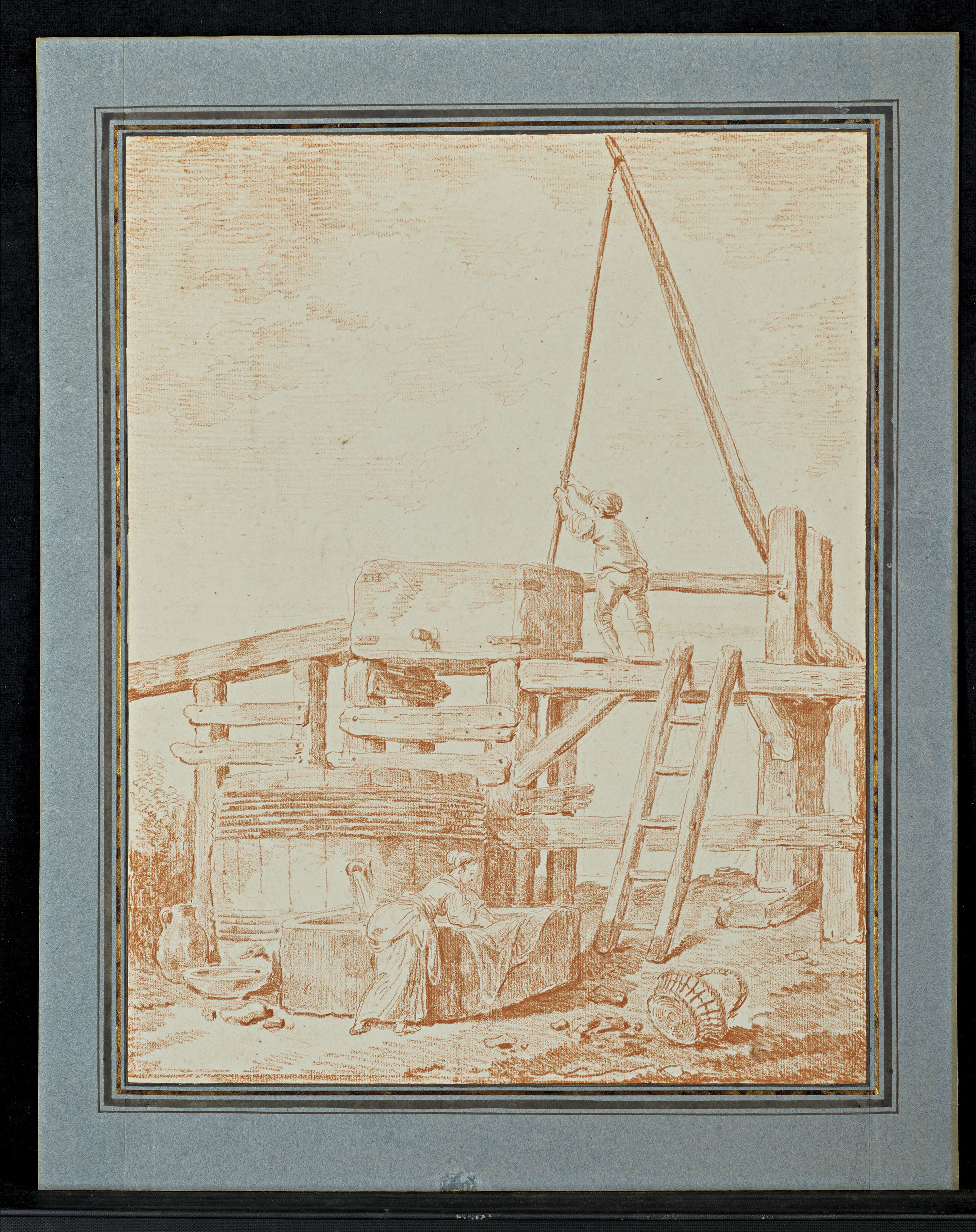 | Homme hissant des chargements devant une lavandière à la fontaine | |