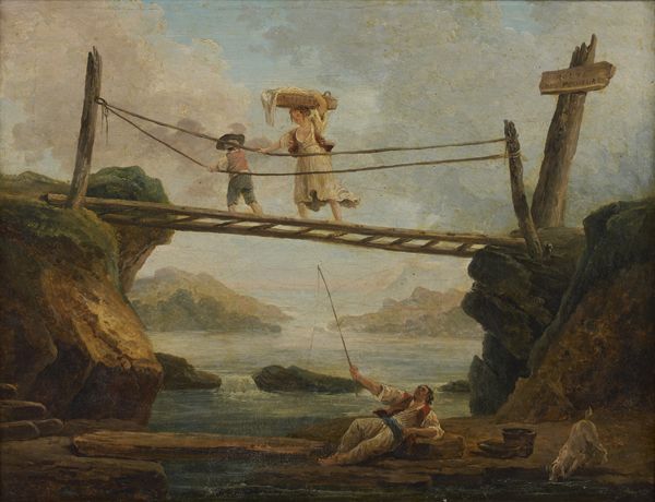 PÊCHEUR DISTRAIT PAR UNE LAVANDIÈRE TRAVERSANT LE PONT