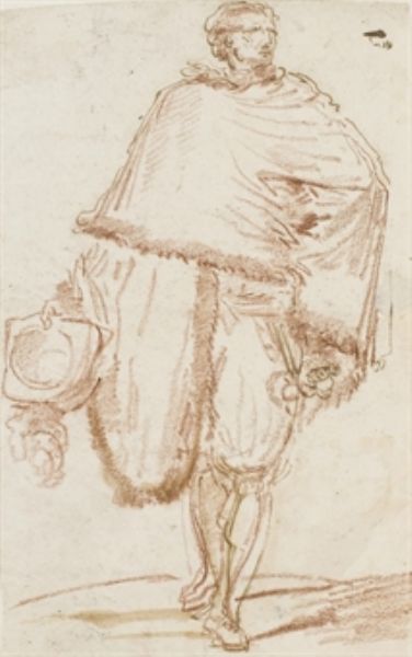 Un homme vu de face avec un chapeau dans la main droite et une épée dans l'autre