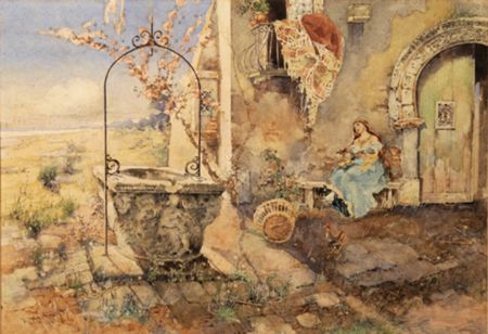 A SPANISH GYPSY WOMAN PLAYING A GUITAR BY A WELL