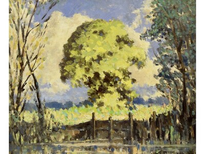 | Sunlit meadow with trees, a stream in the foreground | |