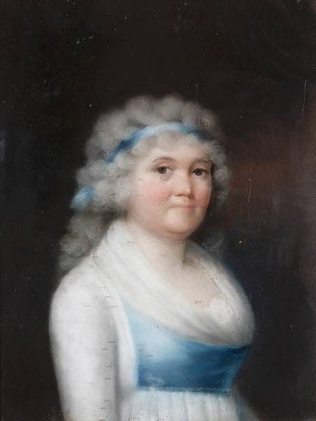 | A portrait of a lady, her powdered hair tied with a blue ribbon and wearing a white gown with blue bodice | |