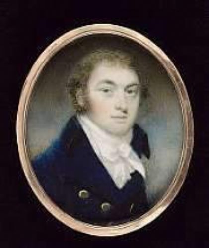 | A Gentleman having curling auburn hair and wearing blue coat, white waistcoat and tied cravat | |