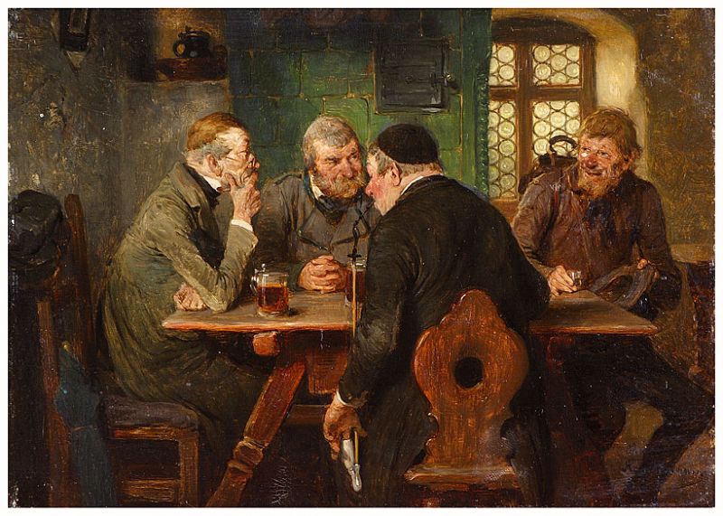 Der ungebetene Gast. Landstreicher mit Schnapsglas am Tisch der