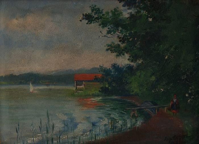 Landschaftsbild mit Hütte am Seeufer