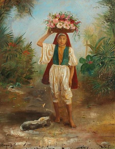 Young Oriental man with flower basket on his head