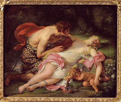 | Procris blessée par Céphale son amant. Il est occupé à retirer le javelot ; l'Amour aux genoux de Procris se désole et éteint so | |