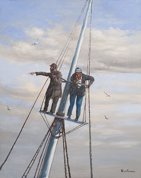 Depicting two men in a crow's nest