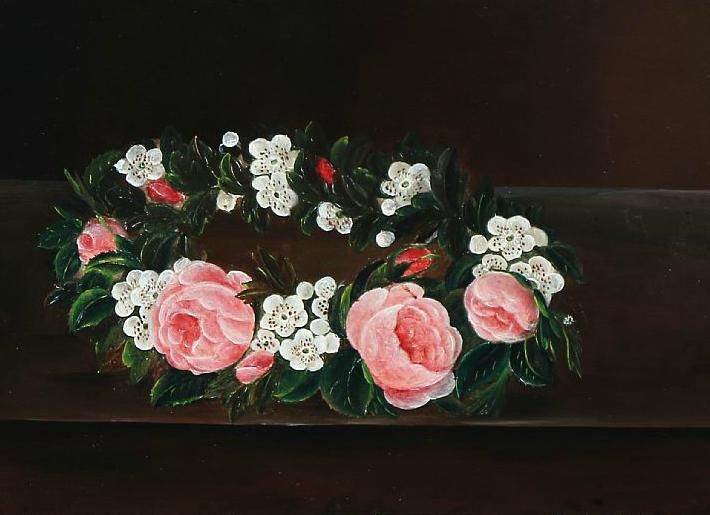A garland of flowers on a stone sill