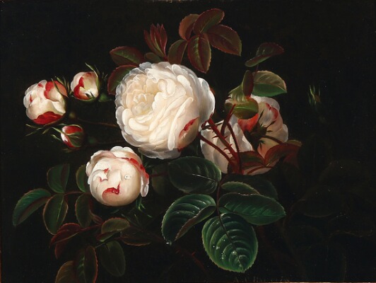 Blooming white roses with dewy leaves