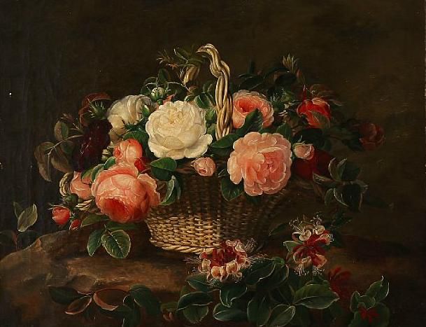 Roses in a basket on a tree stump