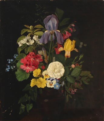 Still life with a bouquet of colourful flowers in a vase on a sill