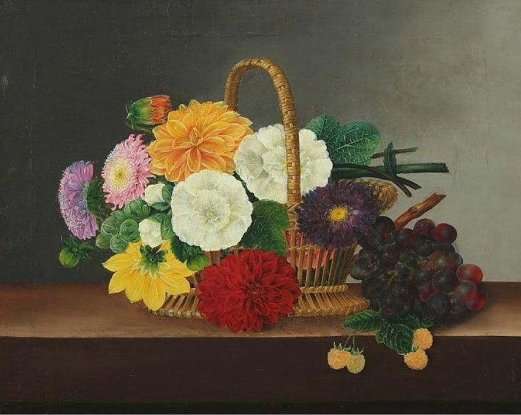 Still life with grapes, yellow raspberries and chrysanthemum in a basket.