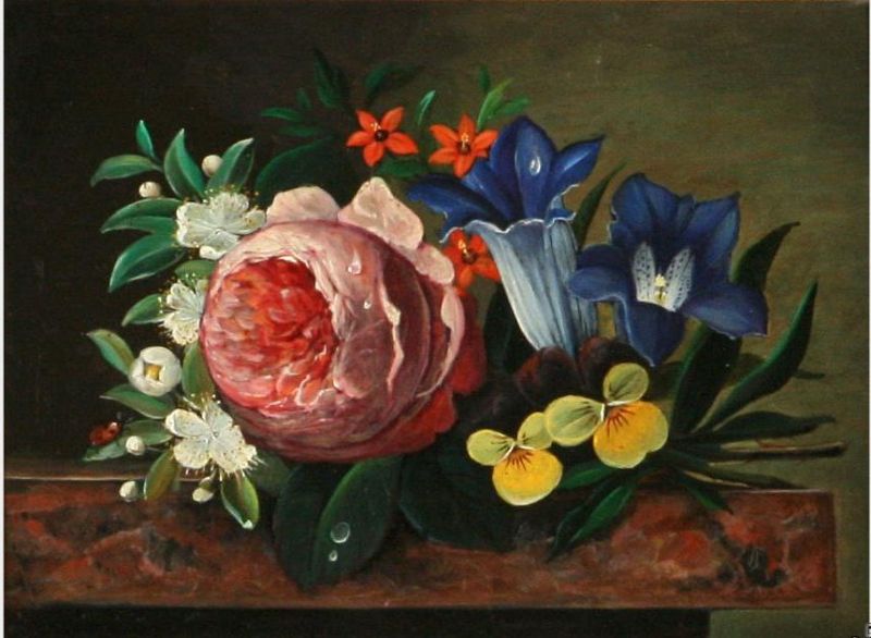Flowers and a ladybird on a sill