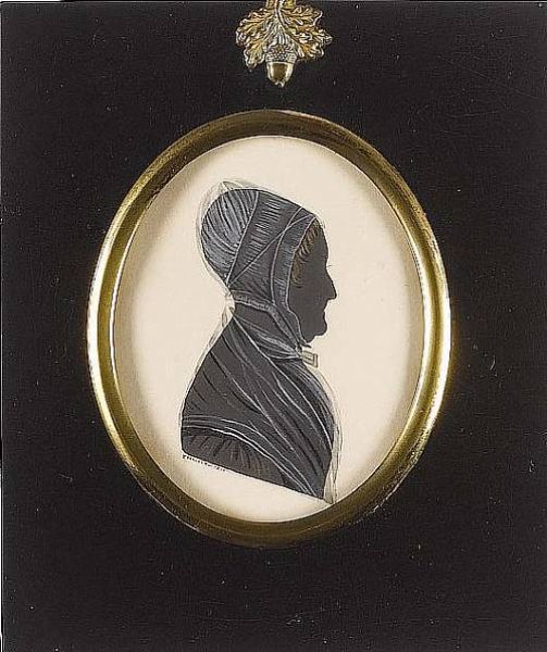A silhouette of a lady, profile to the right, wearing dress, fichu, cape and cornet cap
