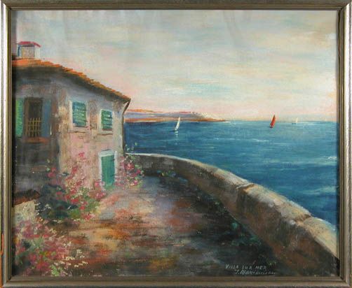 | Einsam gelegenes, südländisches Haus an einer weiten Meeresbucht, auf der Wasserfläche einige Segelboote | |