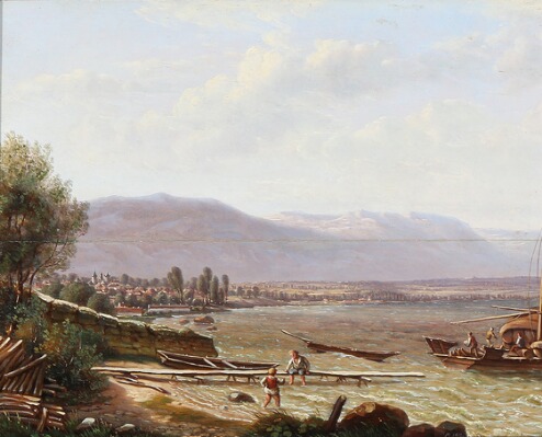 | Mountainous coastal scene with a boat being loaded with goods | |