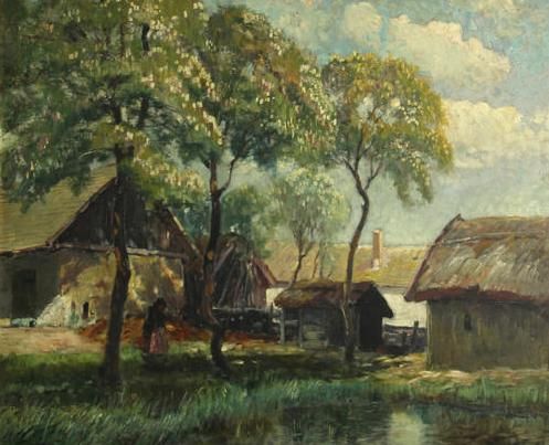 Farm buildings with a figure by a pond