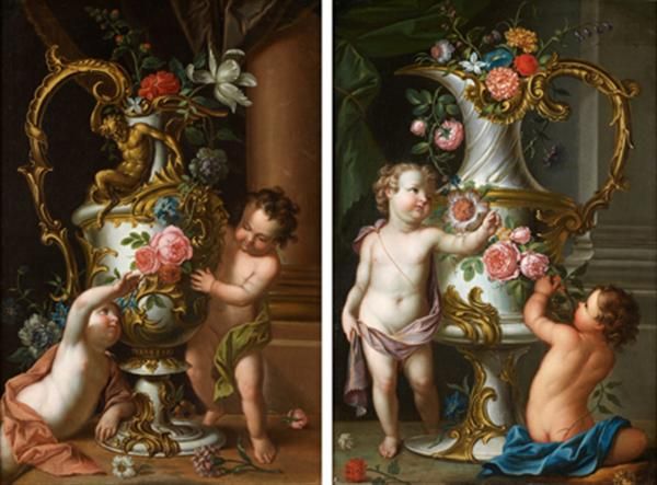 Aiguières sculptées décorées de guirlandes de fleurs par des putti