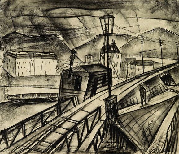 Eisenbahndamm in Vorstadtlandschaft mit Fluss