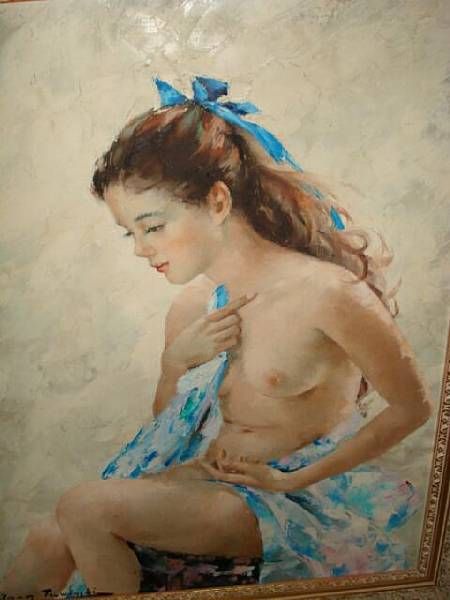Portrait study of a nude young woman wearing blue ribbons in her hair