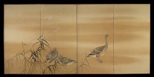 Leaf four-leaf screens; each one painted in sumi and colour on silk