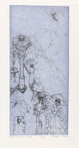 Nächtliche Straßenszene bei Regen mit jungen Frauen unter Schirmen