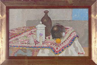 | Still life of a shell, an orange, a vase with a pansy and jars on a colorful clothed table | |