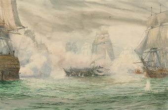 | Trafalgar: In the midst of battle, with H.M.S. Neptune's officers looking across at the dismasted hulk of the Belleisle | |