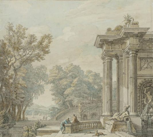 | Caprice architectural avec deux hommes discutant devant une fontaine et une colonnade | |
